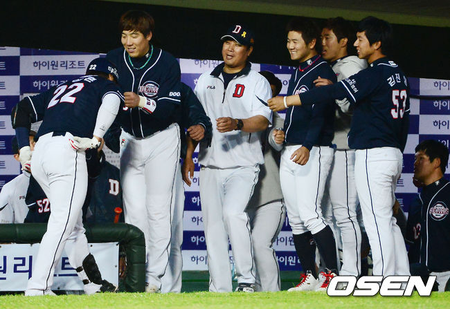 8일 오후 부산 사직구장에서 열린 '2014 한국야쿠르트 세븐 프로야구' 롯데 자이언츠와 두산 베어스의 경기, 3회초 1사 주자없는상황에서 솔로포를 날린 홍성흔이 덕아웃에서 동료들로부터 환영을 받고 있다.