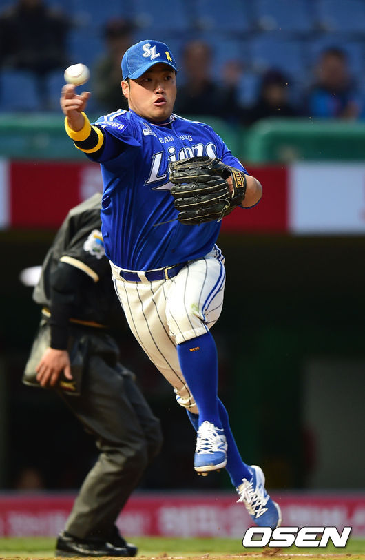 4회말 무사 1루 삼성 박석민이 SK 조동화의 번트 타구를 몸을 날려 잡아낸 뒤 귀루하지 못한 1루 주자 김강민을 잡아내기위해 1루로 송구하고 있다.