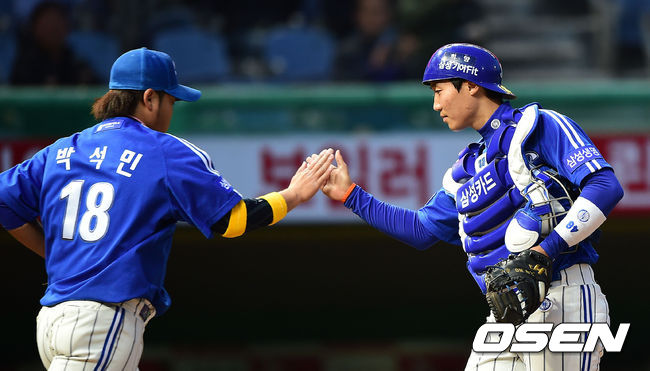 4회말 무사 1루 삼성 이흥련이 SK 조동화의 번트 타구를 잡아 병살로 연결시킨 박석민과 하이파이브를 하고 있다.