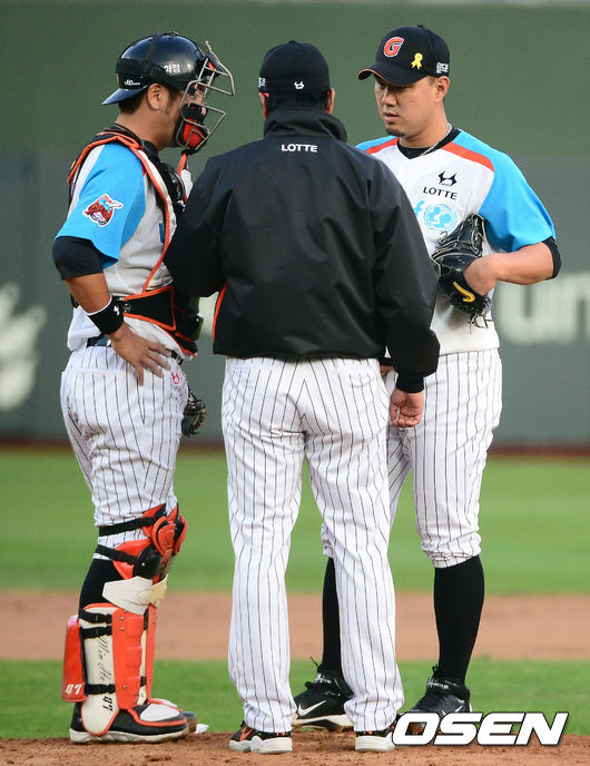 8일 오후 부산 사직구장에서 열린 '2014 한국야쿠르트 세븐 프로야구' 롯데 자이언츠와 두산 베어스의 경기, 1회초 무사 1,2루서 두산 김현수가 우월 스리런을 날린상황. 마운드를 방문한 정민태 롯데 투수코치와 송승준, 강민호가 이야기를 나누고 있다.