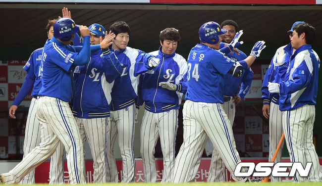 6회초 무사 1루 삼성 최형우가 좌측 담장을 넘기는 투런 홈런을 때린 뒤 동료들과 기뻐하고 있다.