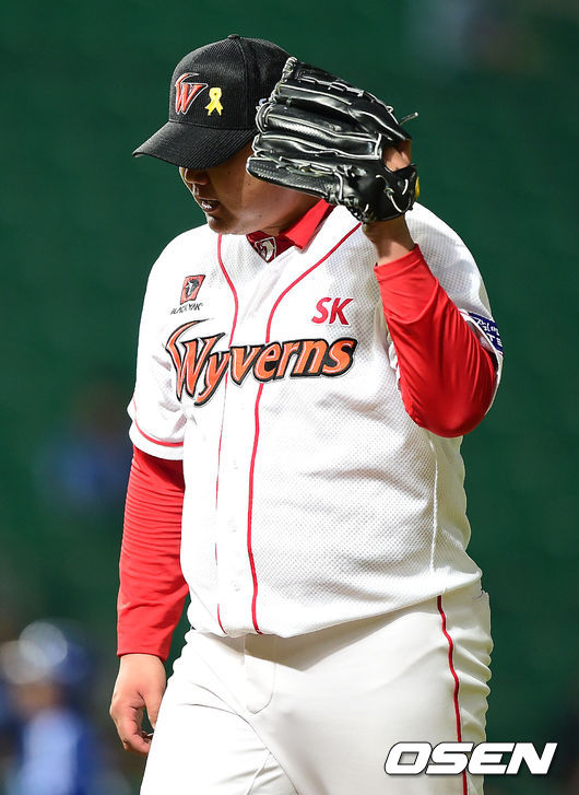 SK 채병룡이 6회초 수비를 마치고 더그아웃으로 들어오면서 아쉬워하고 있다.