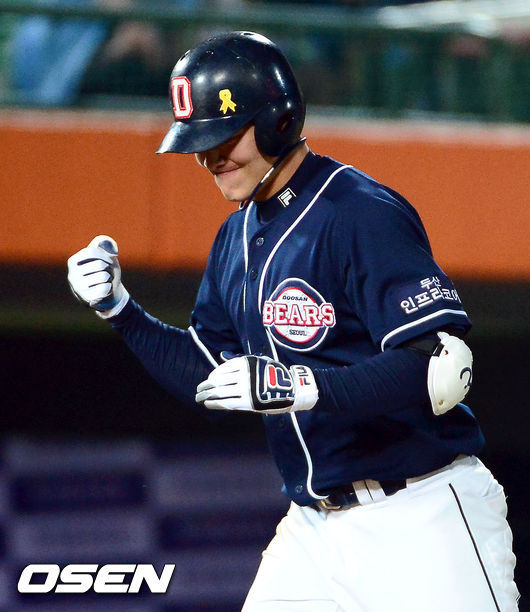 8일 오후 부산 사직구장에서 열린 '2014 한국야쿠르트 세븐 프로야구' 롯데 자이언츠와 두산 베어스의 경기, 4회초 1사 3루 투런포를 날린 민병헌이 그라운드를 돌며 기쁨의 세레모니를 하고 있다.