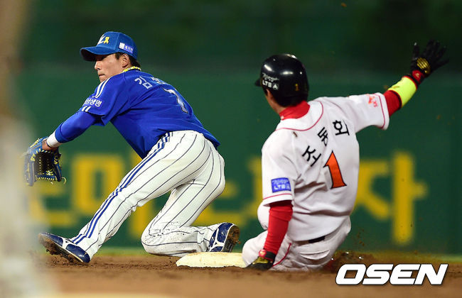 7회말 2사 1루 SK 조동화가 2루 도루에 성공하고 있다.