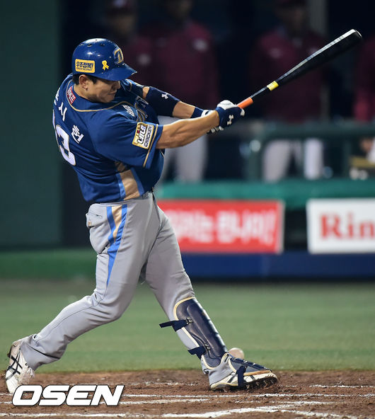 8일 오후 서울 목동구장에서 열린 ‘2014 한국야쿠르트 세븐 프로야구’ 넥센 히어로즈와 NC 다이노스의 경기, 7회초 1사 주자 1,2루 NC 손시헌의 파울 타구가 자신의 다리를 맞추고 있다.