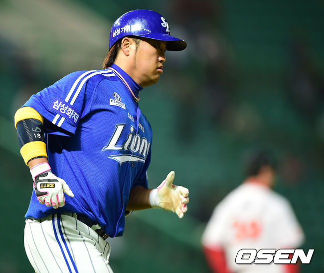 8회초 1사 1루 삼성 박석민이 투런 홈런을 때린 뒤 베이스를 돌고 있다.