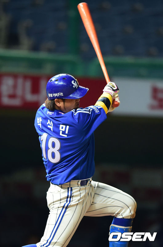8회초 1사 1루 삼성 박석민이 투런 홈런을 때리고 있다.