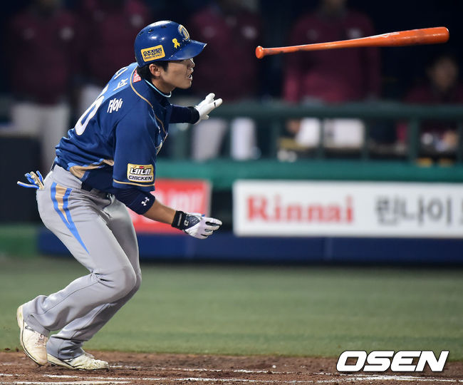 8일 오후 서울 목동구장에서 열린 ‘2014 한국야쿠르트 세븐 프로야구’ 넥센 히어로즈와 NC 다이노스의 경기, 7회초 1사 주자 1,2루 NC 지석훈이 중견수 앞 1타점 적시타를 날리고 있다.