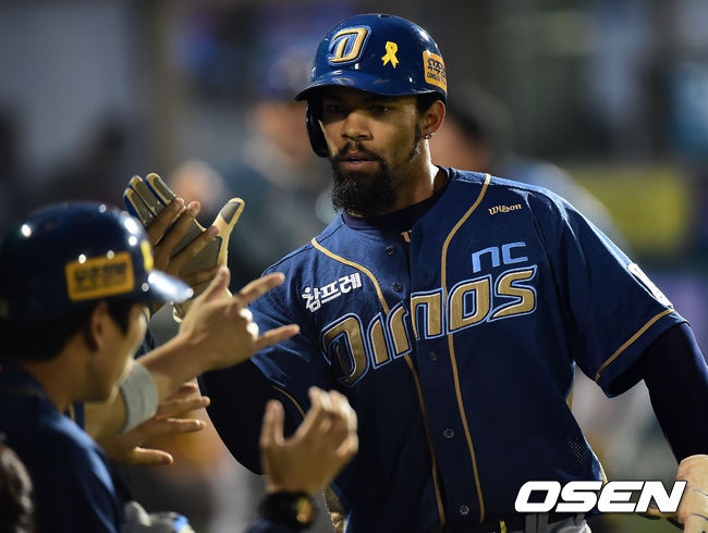 8일 오후 서울 목동구장에서 열린 ‘2014 한국야쿠르트 세븐 프로야구’ 넥센 히어로즈와 NC 다이노스의 경기, 7회초 1사 주자 1,2루 NC 지석훈이 중견수 앞 1타점 적시타때 홈을 밟은 테임즈가 덕아웃에서 동료들과 하이파이브를 하고 있다.