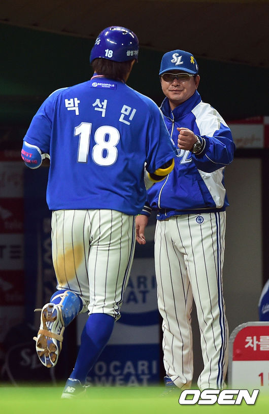 8회초 1사 1루 삼성 류중일 감독이 투런포를 때린 박석민과 하이파이브를 하고 있다.