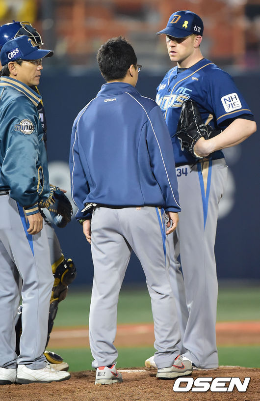 8일 오후 서울 목동구장에서 열린 ‘2014 한국야쿠르트 세븐 프로야구’ 넥센 히어로즈와 NC 다이노스의 경기, 7회말 1사 주자 1루 넥센 이택근 타석에서 NC 최일언 투수 코치가 마운드에 올라 선발 에릭에게 말을 걸고 있다.