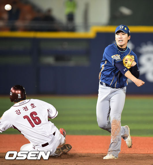 8일 오후 서울 목동구장에서 열린 ‘2014 한국야쿠르트 세븐 프로야구’ 넥센 히어로즈와 NC 다이노스의 경기, 8회 1사 넥센 김민성의 투수 앞 땅볼때 NC 지석훈이 1루로 송구하고 있다.