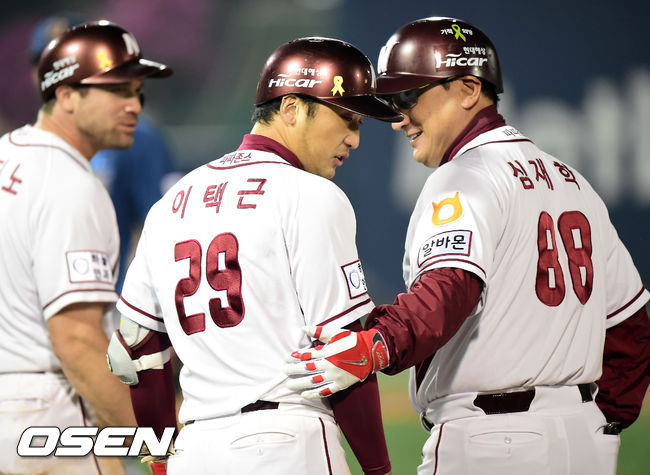 9회말 1사 주자 만루 넥센 이택근이 우익수 희생플라이로 경기를 끝낸 후 심재학 코치와 로티노에게 축하를 받고 있다./ rumi@osen.co.kr