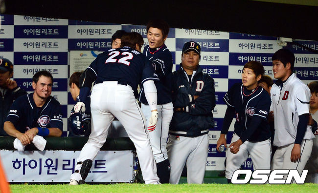 8일 오후 부산 사직구장에서 열린 '2014 한국야쿠르트 세븐 프로야구' 롯데 자이언츠와 두산 베어스의 경기, 8회초 선두타자 홍성흔이 솔로홈런을 날린후 덕아웃에서 동료들로부터 환영을 받고 있다.
