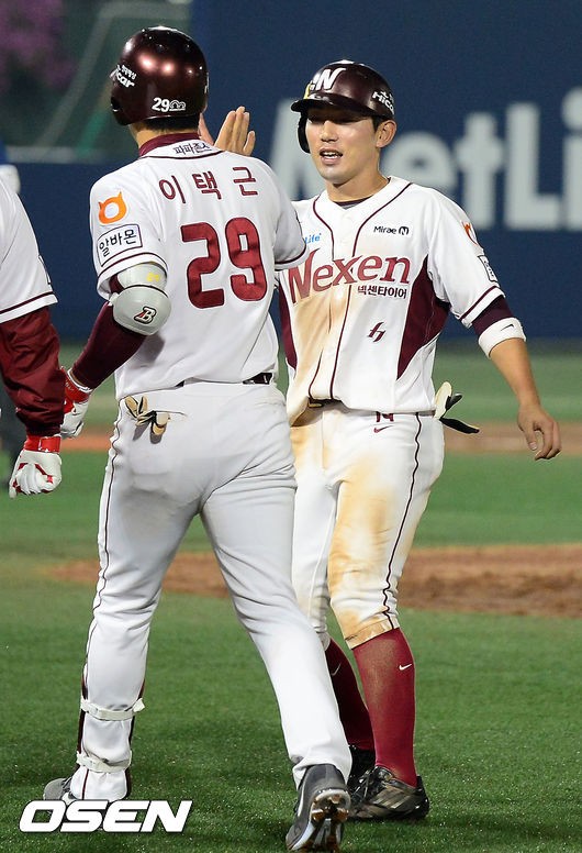 경기를 마치고 넥센 서건창이 이택근과 하이파이브를 하고 있다. / rumi@osen.co.kr
