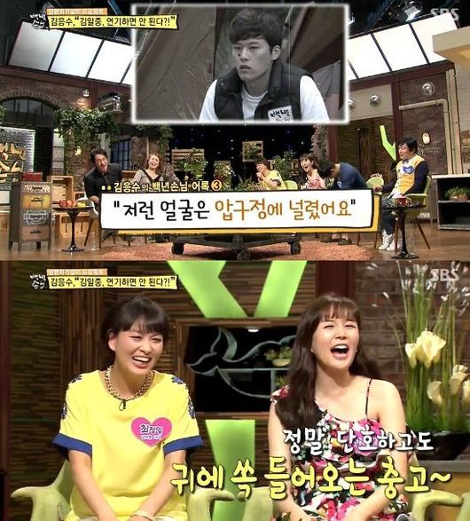 김응수는 8일 오후 방송된 SBS 예능프로그램 '자기야-백년손님'에서 "김일중이 그렇게 연기랄 하고 싶어한다. 정말 연기를 정말 해도 되는지 물어보고 싶었다"는 김환 아나운서의 질문을 "저 정도면 압구정 가면 널렸다"고 일축했다.
