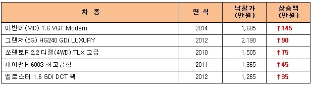 이 날 최고가 낙찰차량은 2013년형 '베라크루즈 300VXL(4WD)'가 차지했으며 금액은 3485만원에 낙찰됐다. 이 차량은 출품자 희망가 대비 가장 높은 상승액을 보인 차량이다.