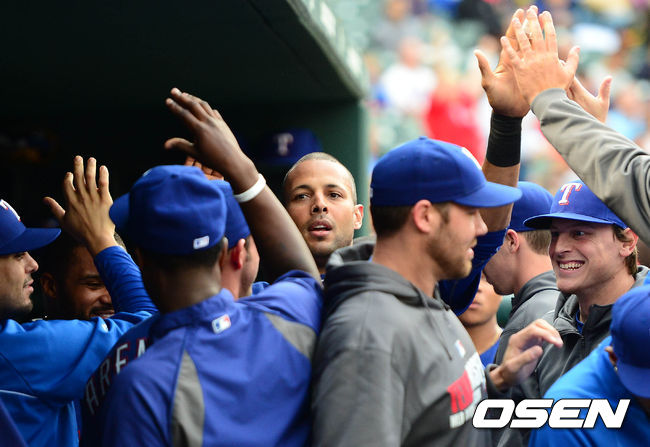 9일(이하 한국시각) 미국 텍사스주 알링턴 글로브 라이프 파크에서 열린 '2014 메이저리그' 텍사스 레인저스와 콜로라도 로키스의 경기 2회말 1사 2루 마틴의 1타점 적시타에 리오스가 득점 후 덕아웃에서 동료들과 하이파이브를 하고 있다.