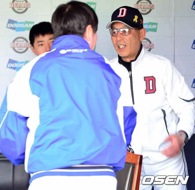 경기에 앞서 두산 송일수 감독이 삼성 류중일 감독과 인사를 나누고 있다.