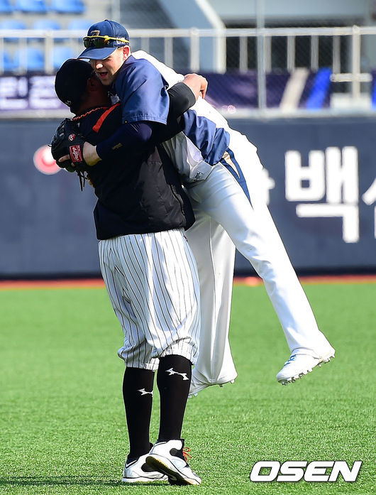9일 오후 경남 마산구장에서 열린 '2014 한국야쿠르트 세븐 프로야구' NC 다이노스와 롯데 자이언츠의 경기에 앞서 롯데 히메네스가 NC 에릭을 번쩍 들며 인사를 나누고 있다.