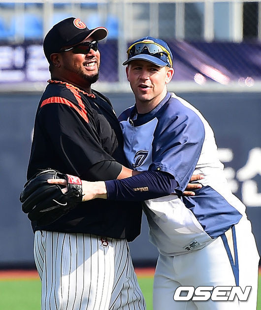 9일 오후 경남 마산구장에서 열린 '2014 한국야쿠르트 세븐 프로야구' NC 다이노스와 롯데 자이언츠의 경기에 앞서 롯데 히메네스와 NC 에릭이 미소짓고 있다.