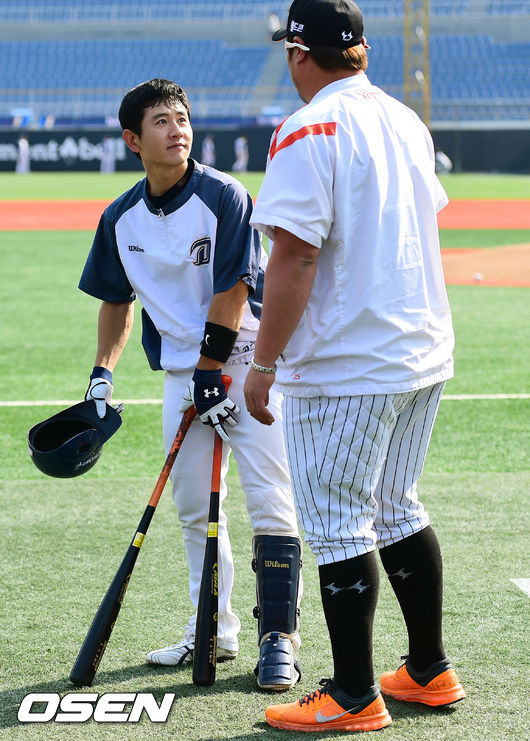 9일 오후 경남 마산구장에서 열린 '2014 한국야쿠르트 세븐 프로야구' NC 다이노스와 롯데 자이언츠의 경기에 앞서 NC 손시헌이 롯데 최준석이 이야기를 나누고 있다.