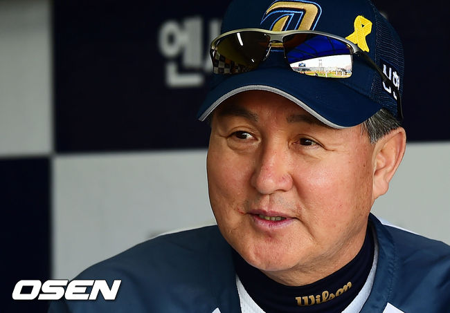 9일 오후 경남 마산구장에서 열린 '2014 한국야쿠르트 세븐 프로야구' NC 다이노스와 롯데 자이언츠의 경기에 앞서 NC 김경문 감독이 덕아웃에서 취재기자들과 이야기를 나누고 있다.