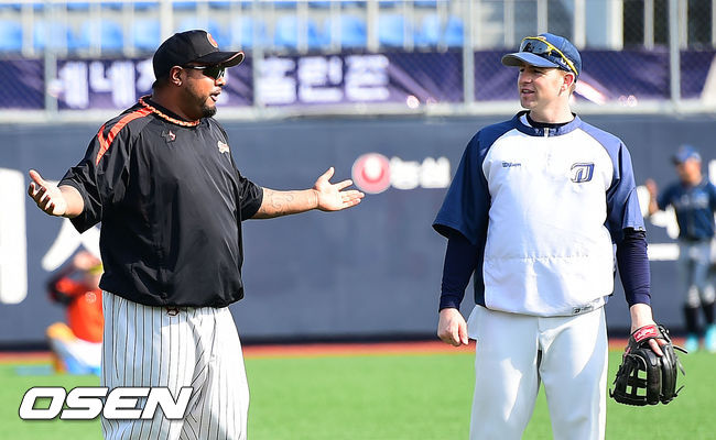 9일 오후 경남 마산구장에서 열린 '2014 한국야쿠르트 세븐 프로야구' NC 다이노스와 롯데 자이언츠의 경기에 앞서 롯데 히메네스와 NC 에릭이 이야기를 나누고 있다.
