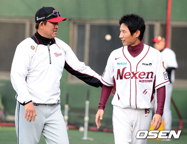 경기에 앞서 LG 조계현 수석코치와 넥센 염경엽 감독이 인사를 나누고 있다.