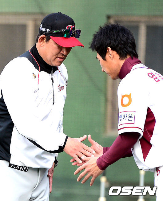 경기에 앞서 LG 조계현 수석코치와 넥센 염경엽 감독이 인사를 나누고 있다.