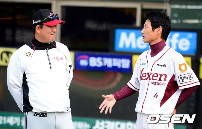 경기에 앞서 LG 조계현 수석코치와 넥센 염경엽 감독이 인사를 나누고 있다.