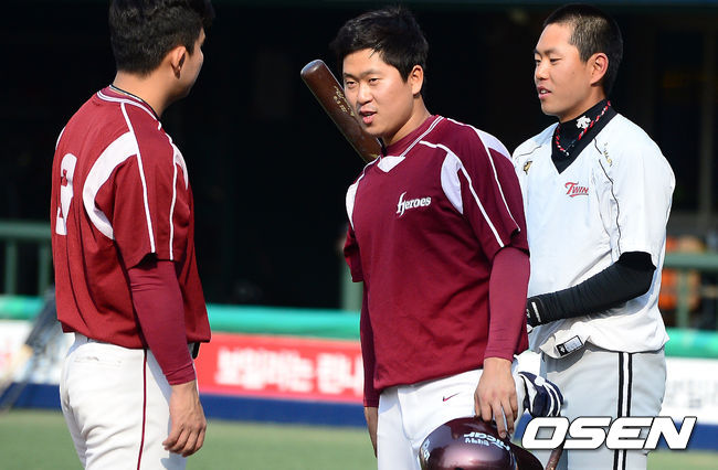 경기에 앞서 LG 백창수가 넥센 김민성, 김지수와 이야기를 나누고 있다.