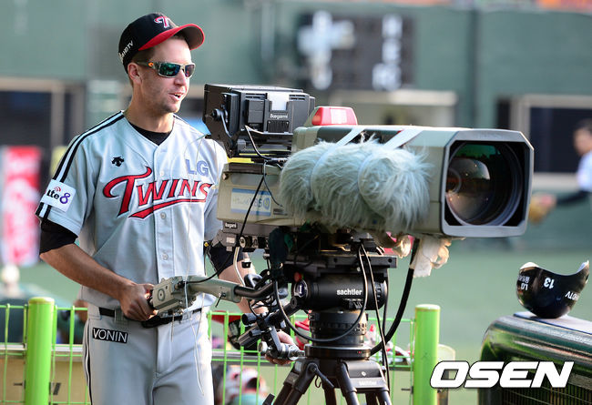 경기에 앞서 LG 티포드가 중계 카메라를 조작하며 즐거워하고 있다.