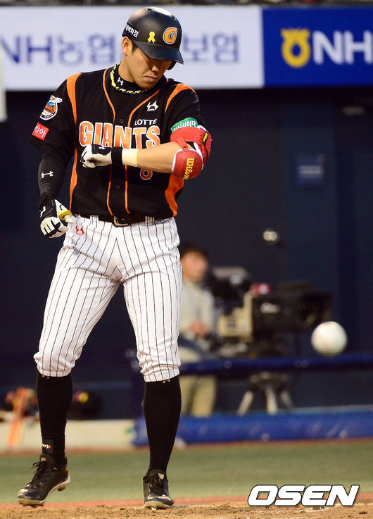 9일 오후 경남 마산구장에서 열린 '2014 한국야쿠르트 세븐 프로야구' NC 다이노스와 롯데 자이언츠의 경기, 3회초 1사 2루 NC 선발 이민호가 던진 볼에 맞은 롯데 전준우가 자신의 몸 상태를 살피고 있다.