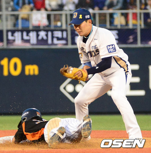 9일 오후 경남 마산구장에서 열린 '2014 한국야쿠르트 세븐 프로야구' NC 다이노스와 롯데 자이언츠의 경기, 3회초 1사 주자 1루 롯데 전준우 타석때 1루 주자 정훈이 2루 도루에 성공하고 있다.