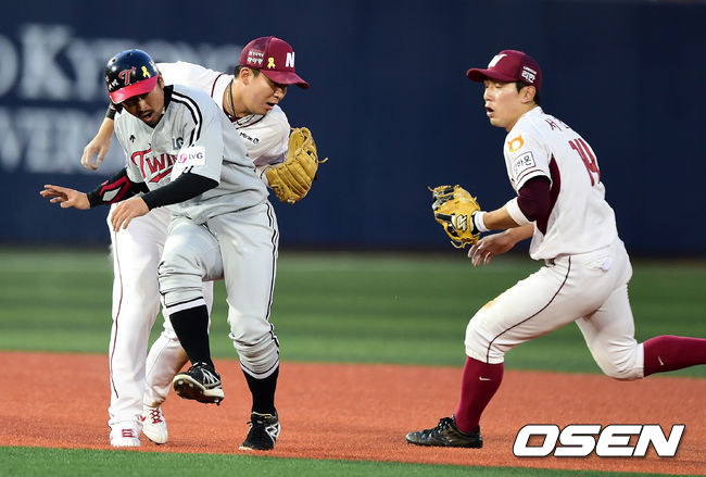 3회초 1사 2,3루에서 LG 정의윤의 내야땅볼에 협살에 걸린 2루 주자 이병규가 넥센 김민성과 부딪히고 있다. 김민성의 주루방해가 선언되며 이병규는 3루에 진루.