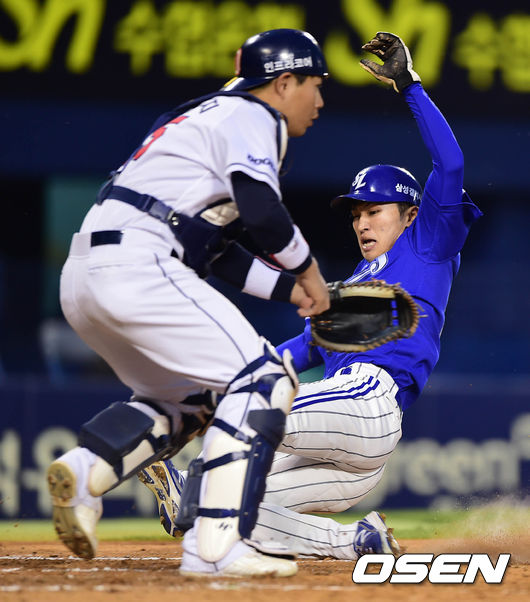 4회초 무사 3루 삼성 이지영의 희생플라이때 3루주자 박해민이 태그업을 시도, 홈에서 세이프 되고 있다.