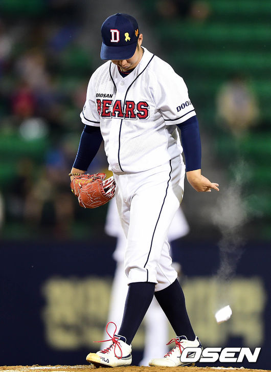 5회초 2사 1루에서 삼성 박석민에게 좌월 투런 홈런을 허용한 두산 유희관이 아쉬워하고 있다.