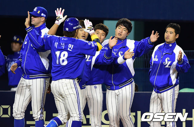 5회초 2사 1루에서 삼성 박석민이 좌월 투런 홈런을 날리고 더그아웃에서 동료들과 하이파이브를 하고 있다.