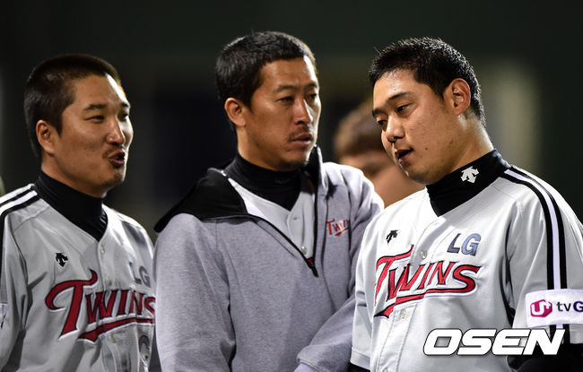 5회말 2사 1,3루에서 LG 류제국이 넥센 강정호를 2루땅볼로 처리하며 위기를 넘기고 더그아웃으로 향하며 이진영, 이병규의 격려를 받고 있다.