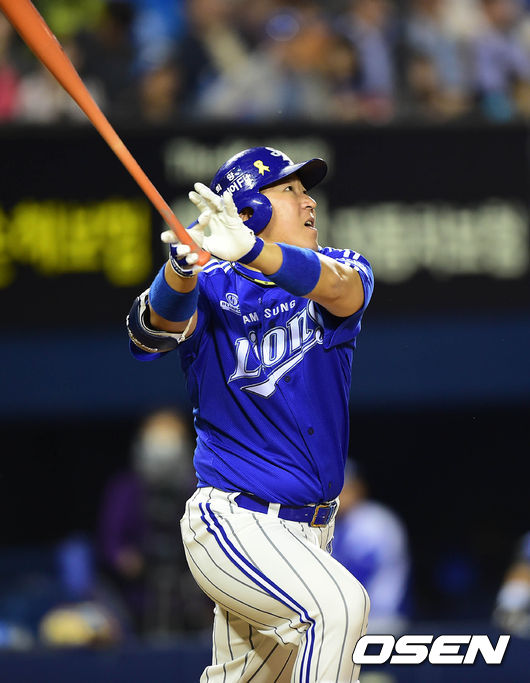 7회초 1사 1루에서 삼성 최형우가 우월 투런 홈런을 치고 있다.