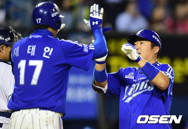 7회초 1사 1루에서 삼성 최형우가 우월 투런 홈런을 치고 홈에서 채태인과 하이파이브를 하고 있다.