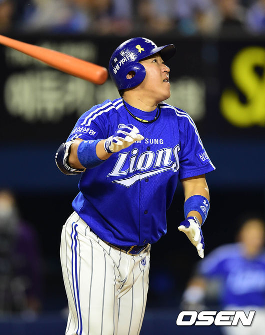 7회초 1사 1루에서 삼성 최형우가 우월 투런 홈런을 치고 있다.