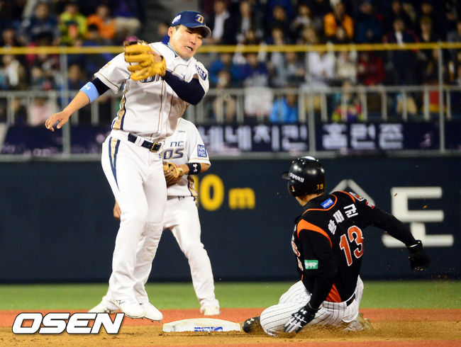 9일 오후 경남 마산구장에서 열린 '2014 한국야쿠르트 세븐 프로야구' NC 다이노스와 롯데 자이언츠의 경기, 8회초 1사 1루 황재균이 도루를 시도할때, NC 1루수 테임즈의 송구 실책으로 2루에 세이프 하고 있다
