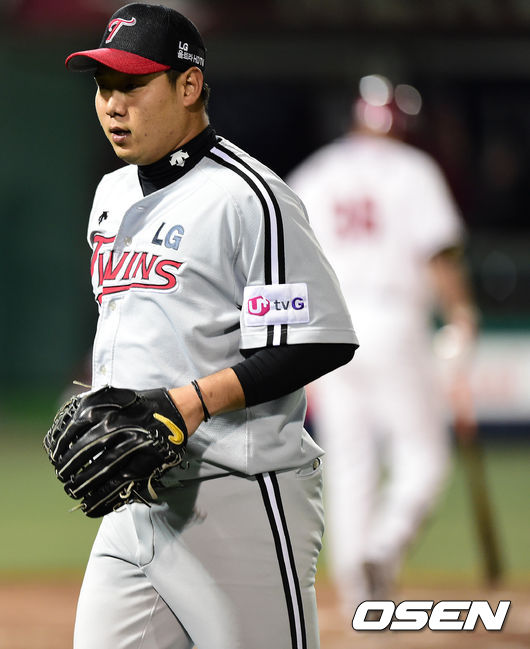 6회말 2사에서 LG 류제국이 넥센 이성열을 삼진으로 처리하며 더그아웃으로 향하고 있다.