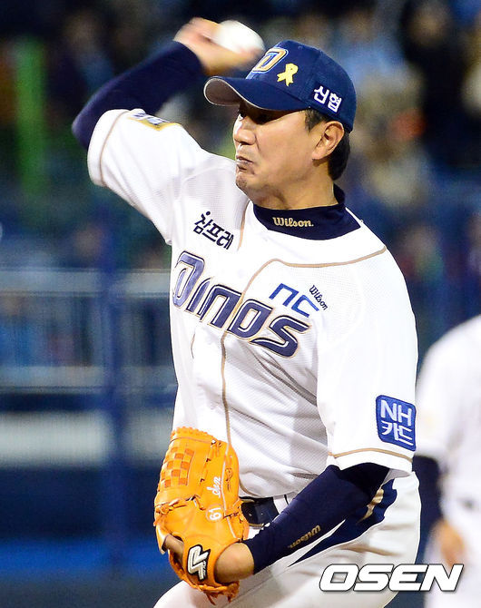 9일 오후 경남 마산구장에서 열린 '2014 한국야쿠르트 세븐 프로야구' NC 다이노스와 롯데 자이언츠의 경기, 8회초 2사 2루 NC 이민호에 이은 손민한이 힘차게 공을 뿌리고 있다.