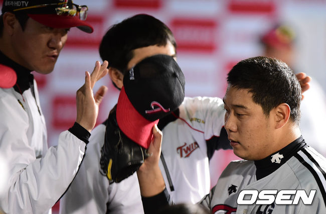 6회말 2사에서 LG 류제국이 넥센 이성열을 삼진으로 처리하고 더그아웃에서 코칭스태프와 하이파이브를 하고 있다.