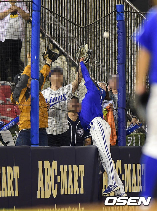 8회말 1사에서 삼성 박해민이 두산 김현수의 파울 타구를 잡기 위해 손을 뻗었으나 놓치고 있다.