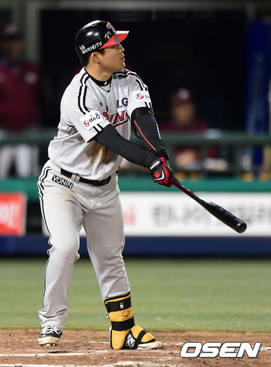 7회초 2사 1루에서 LG 정의윤이 1타점 적시 2루타를 날리고 타구를 바라보고 있다.
