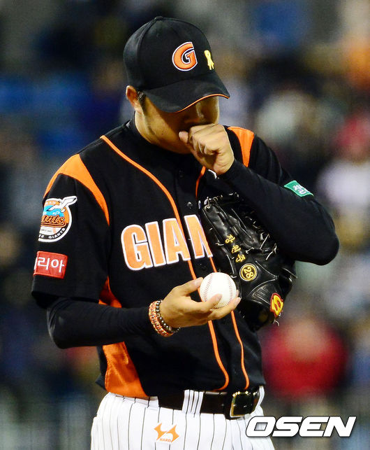 9일 오후 경남 마산구장에서 열린 '2014 한국야쿠르트 세븐 프로야구' NC 다이노스와 롯데 자이언츠의 경기, 8회말 1사 주자없는상황에서 롯데 장원준이 심호흡을 하고 있다.